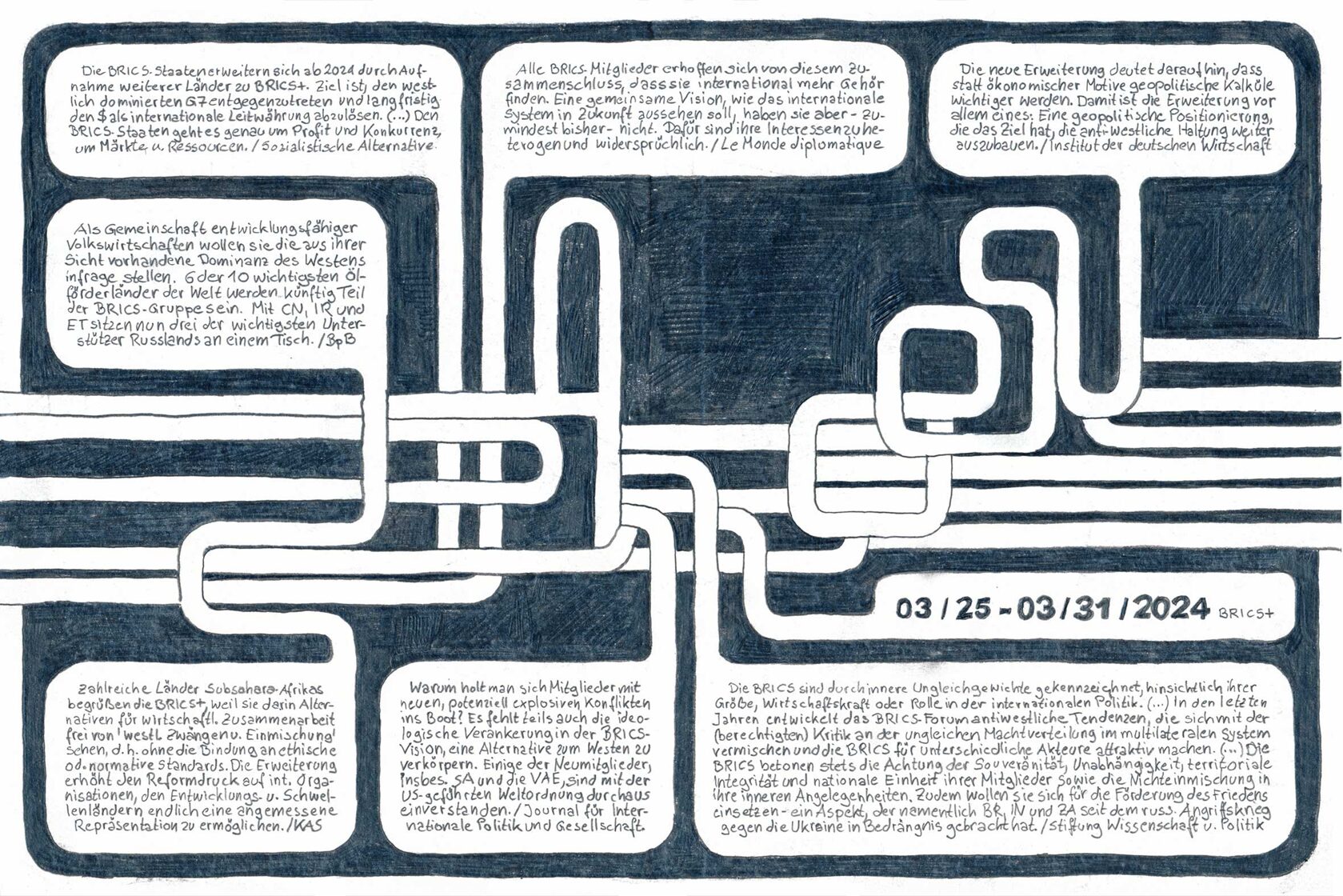 Damit setze ich jede Woche einen Fokus auf einen bestimmten Inhalt, den ich aus der Flut an Informationen und Gedanken, die uns laufend umgeben, auswähle. Im Rückblick ergibt sich ein Bild dessen, was mich in diesem Zeitraum bedrängt und fasziniert hat, es finden sich Überlegungen zu Fragen, die mich beschäftigt haben und Wissenslücken, die sich schließen. Es ist ein Weg, mir die Welt punktuell zu erschließen, künstlerisch-aktiv Wissensproduktion zu betreiben, Sachverhalte und Hintergründe zu recherchieren, die sonst im Rauschen des Alltags untergehen würden - und mich auf ganz andere als nur kognitive Weise mit diesen Themen zu verbinden.